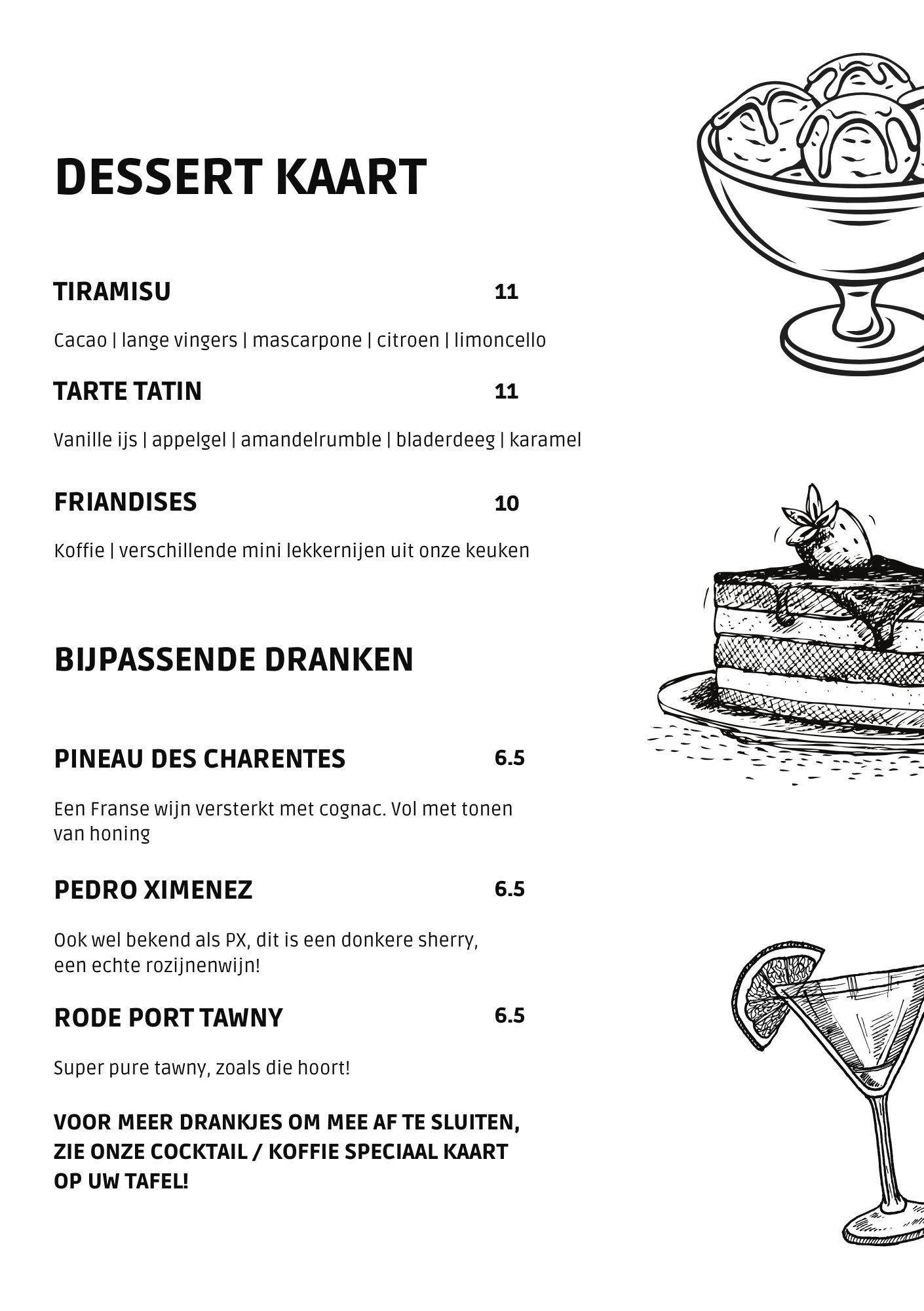 Onze dessertkaart is er om je maaltijd feestelijk af te sluiten. Of gewoon omdat je er zin in hebt! Van romige klassiekers tot frisse verrassingen en alles daartussenin: elk nagerecht wordt met liefde gemaakt door onze chefs!