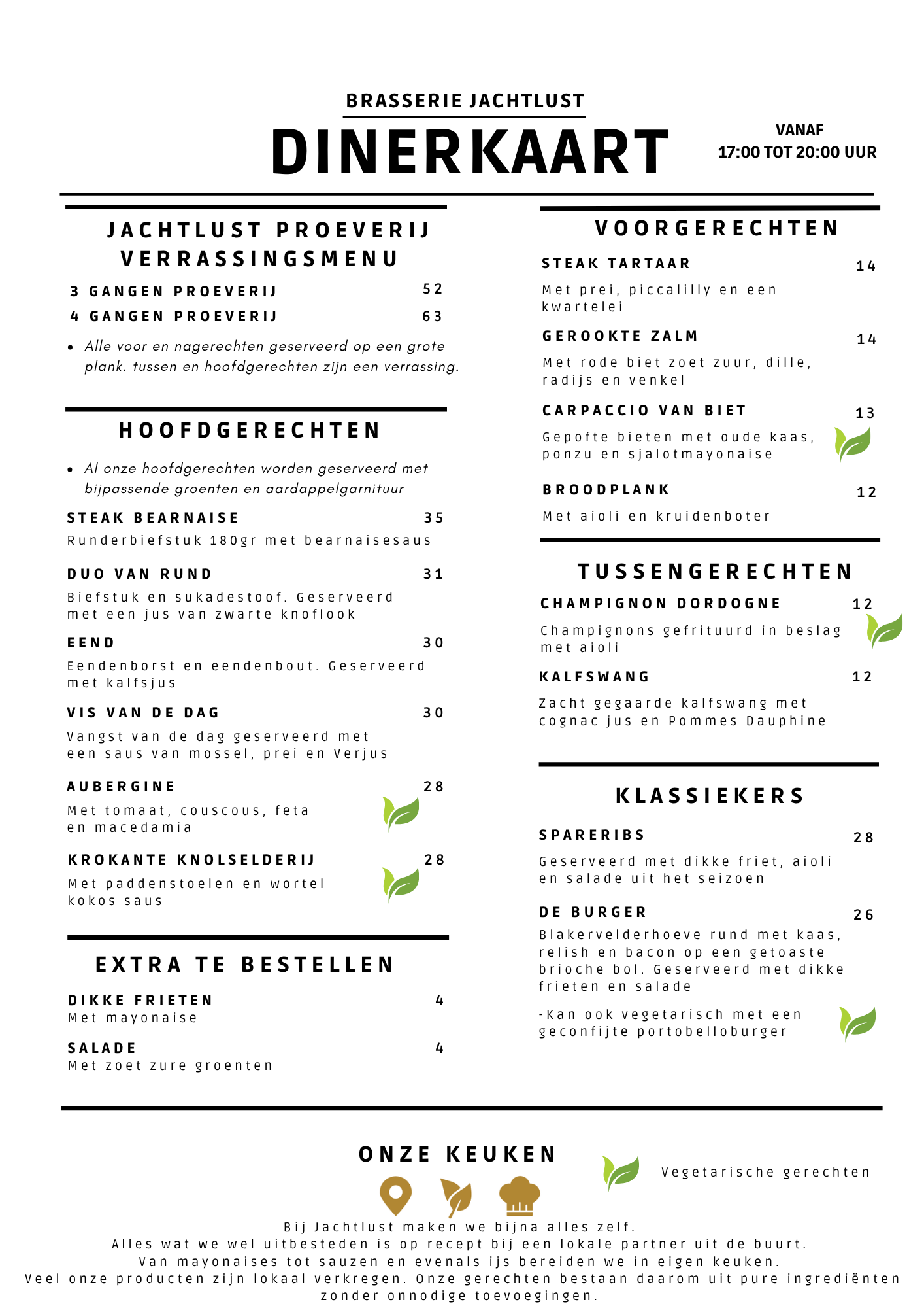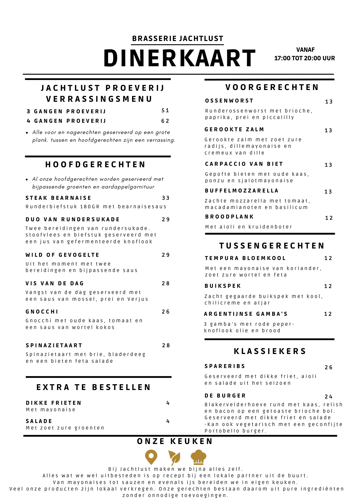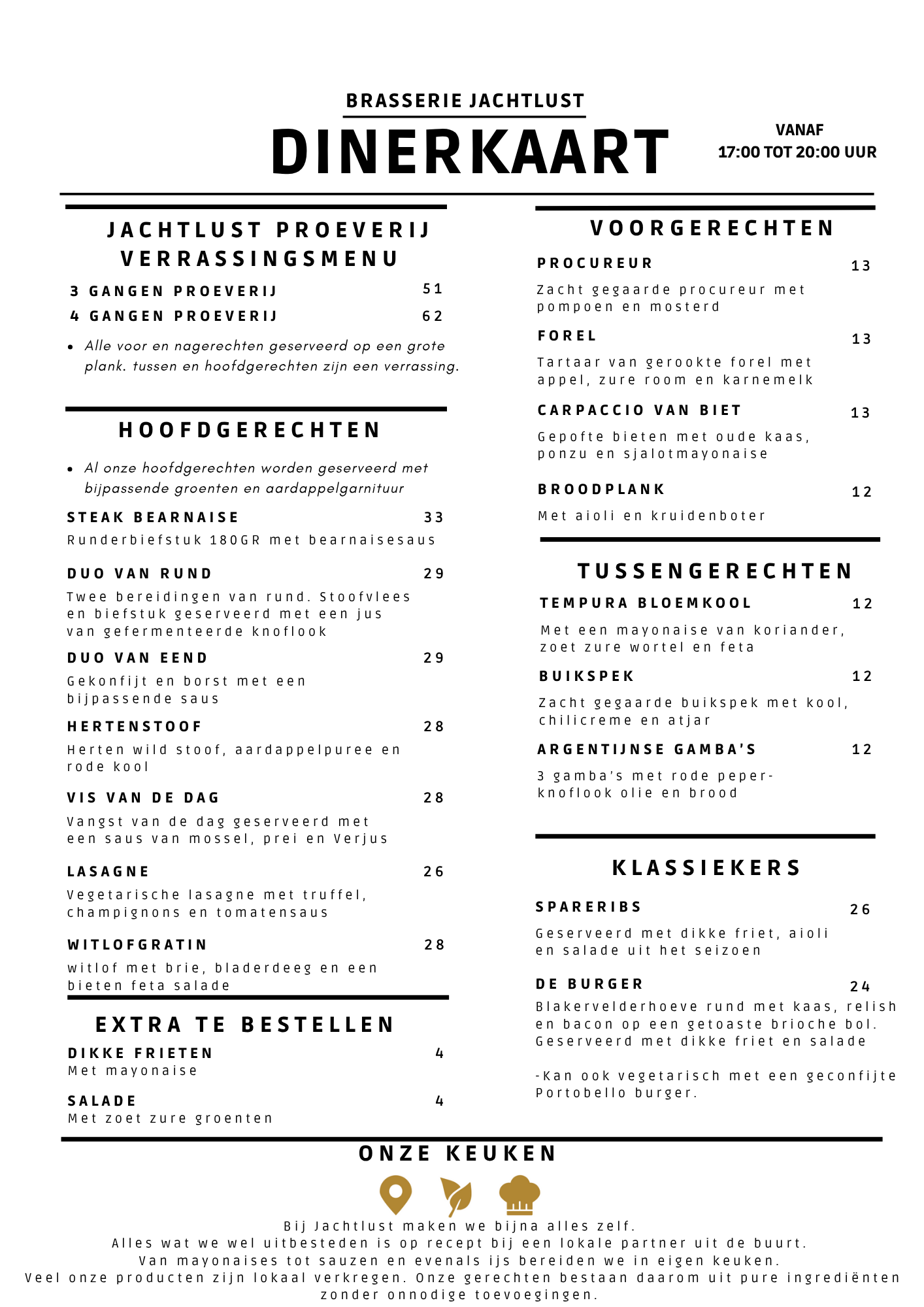 Onze dinerkaart is een ode aan lokaal geteelde ingrediënten, eerlijk verkregen producten en ambachtelijke bereiding. Elk gerecht wordt met zorg samengesteld door onze chefs, die passie combineren met seizoensgebonden smaken.