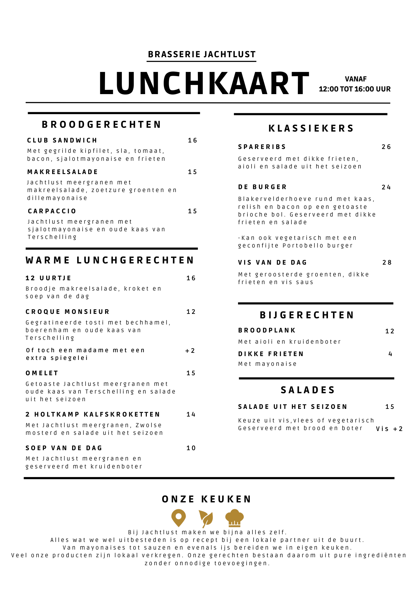 Onze lunchkaart brengt het beste van de streek samen op je bord. Met dagverse, lokale ingrediënten en een ambachtelijke aanpak serveren we gerechten die eenvoudig, maar vol smaak zijn. Van rijk belegde broodjes en frisse salades tot hartige klassiekers met een verrassende twist
